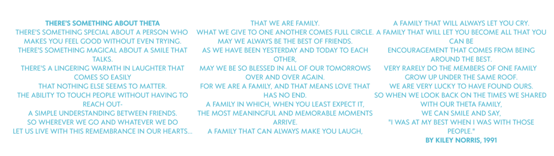 Being a Theta woman means to become a leading woman who is led by and inspired by the people around her. Theta has taught me that being a part of a sorority is so much more than the exciting events. I have gained mentors, a home away from home, and inspiring friends. In addition, I have grown as a leader and learned how to boldly and courageously approach life without holding back. I am so honored to be able to share this exceptional sisterhood with our women. While I am lucky enough to get to lead these women, they are the ones that I look up to! This chapter will forever hold a piece of my heart, and I hope you can also see not only what makes our members stand out, but also the special bond shared by the women of Kappa Alpha Theta.